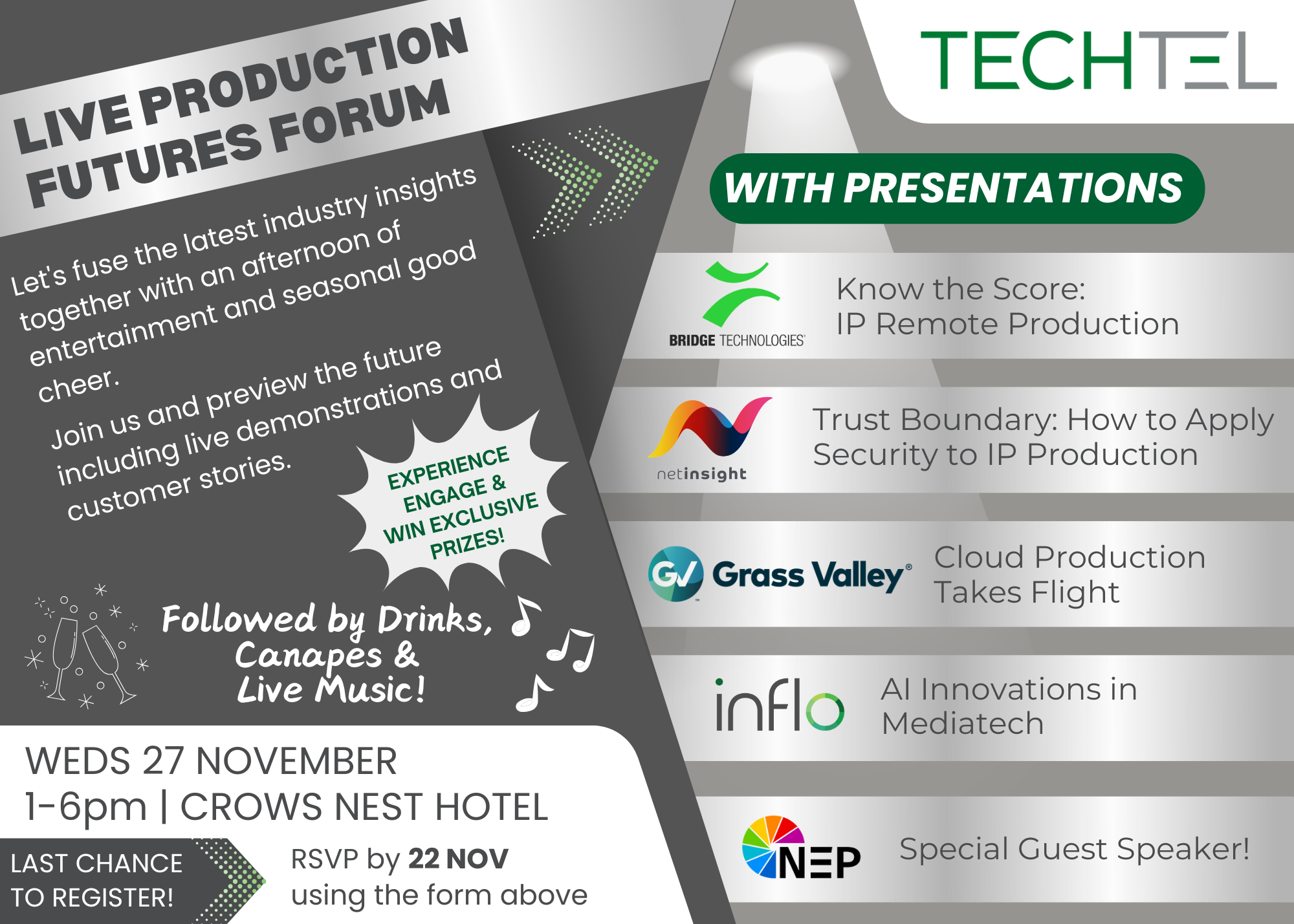 /Techtel are excited to be hosting a Live Production Futures Forum, where we fuse the latest industry insights with an afternoon of entertainment, networking, and innovation. Join us on Wednesday, 27 November, for a unique experience packed with hands-on technology demos, inspiring customer stories, and exclusive opportunities to engage with industry experts.