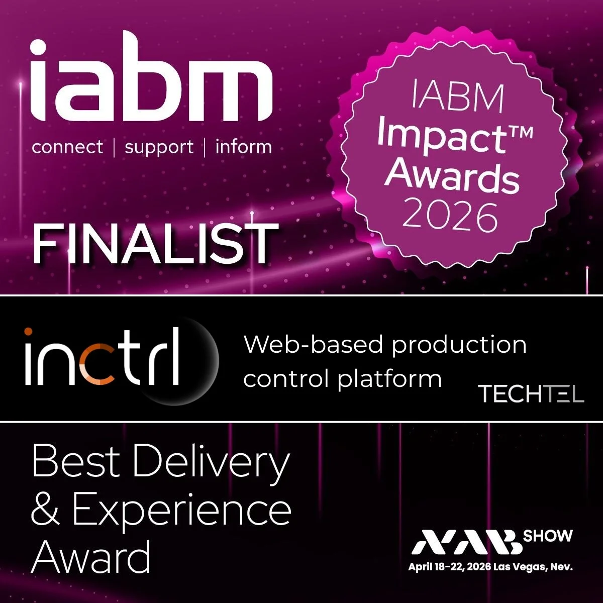 RELEASE UPDATE: Techtel’s inctrl™ – web-based production control platform – has been nominated for the Best Delivery & Experience Award at the IABM IMPACT Awards™ at NAB Show 2026!